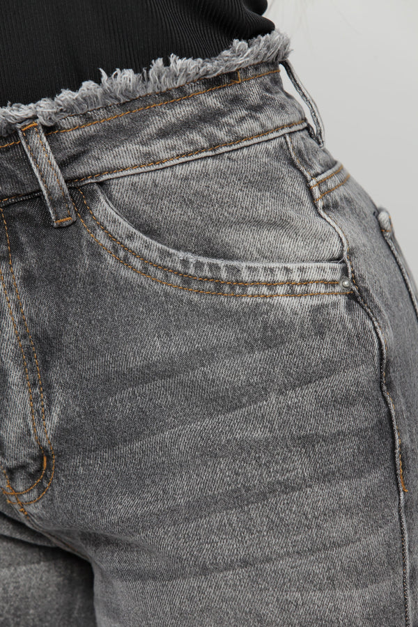 Jean wide leg gris, tela rígida liviana, tono oscuro, tiro alto, con pretina desflecada, botones internos.
